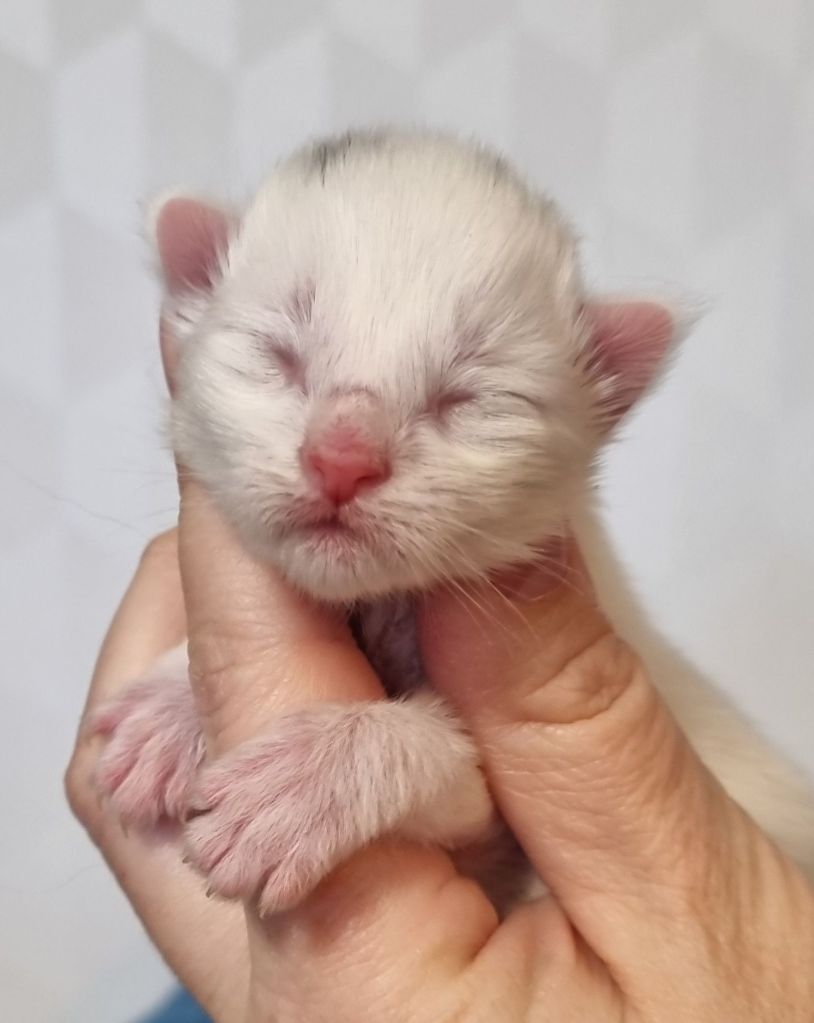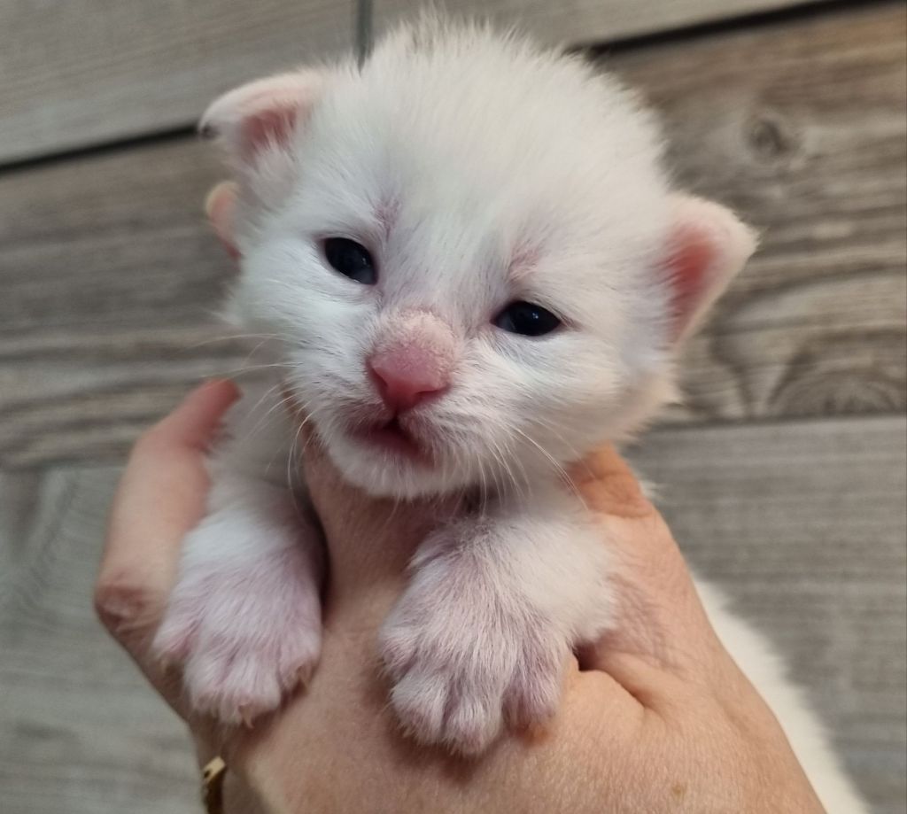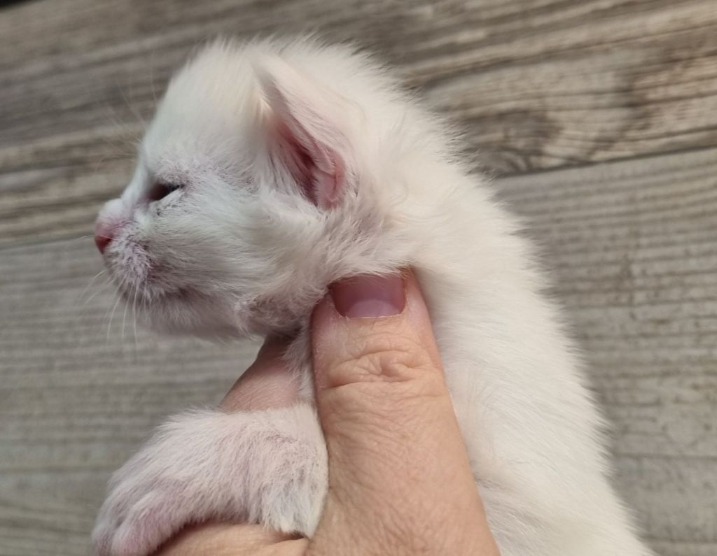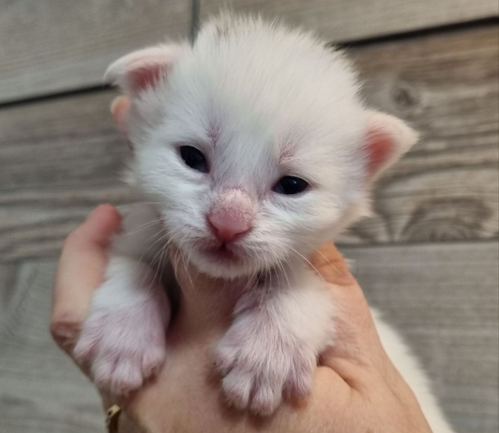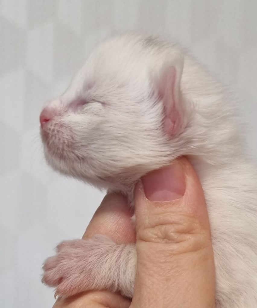 Vit med ”hörselfläckar” på huvudet. Hane.