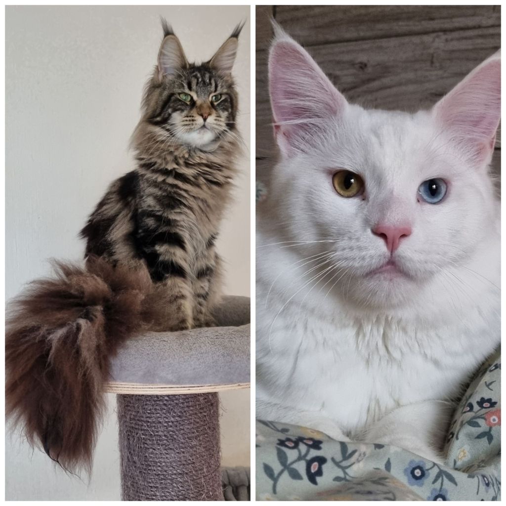 Vad det blir för färg/mönster är alltid lite struligt om en förälder är helt vit. För den vita färgen ”täcker över” den färg katten egentligen har. Enligt Gregors dna-test så är han svart mönstrad (agouti) men bär på solid (non-angouti). Troligen är han tigré. Han bär även på dilution, vilket Evie även gör så det finns även chans på blå/blå mönstrad.